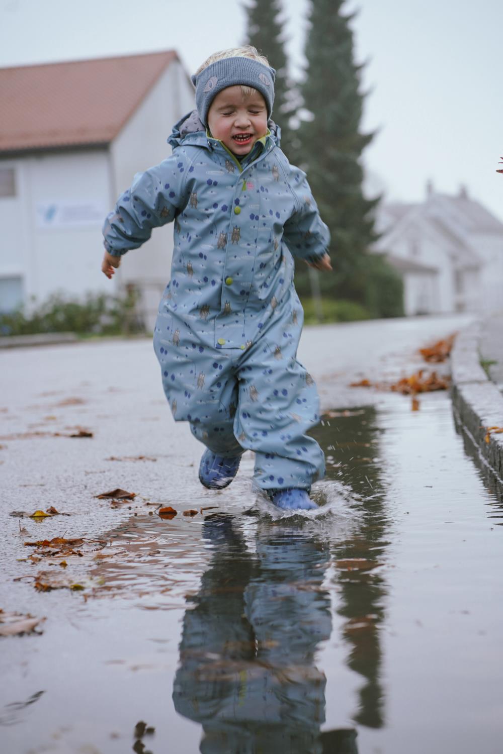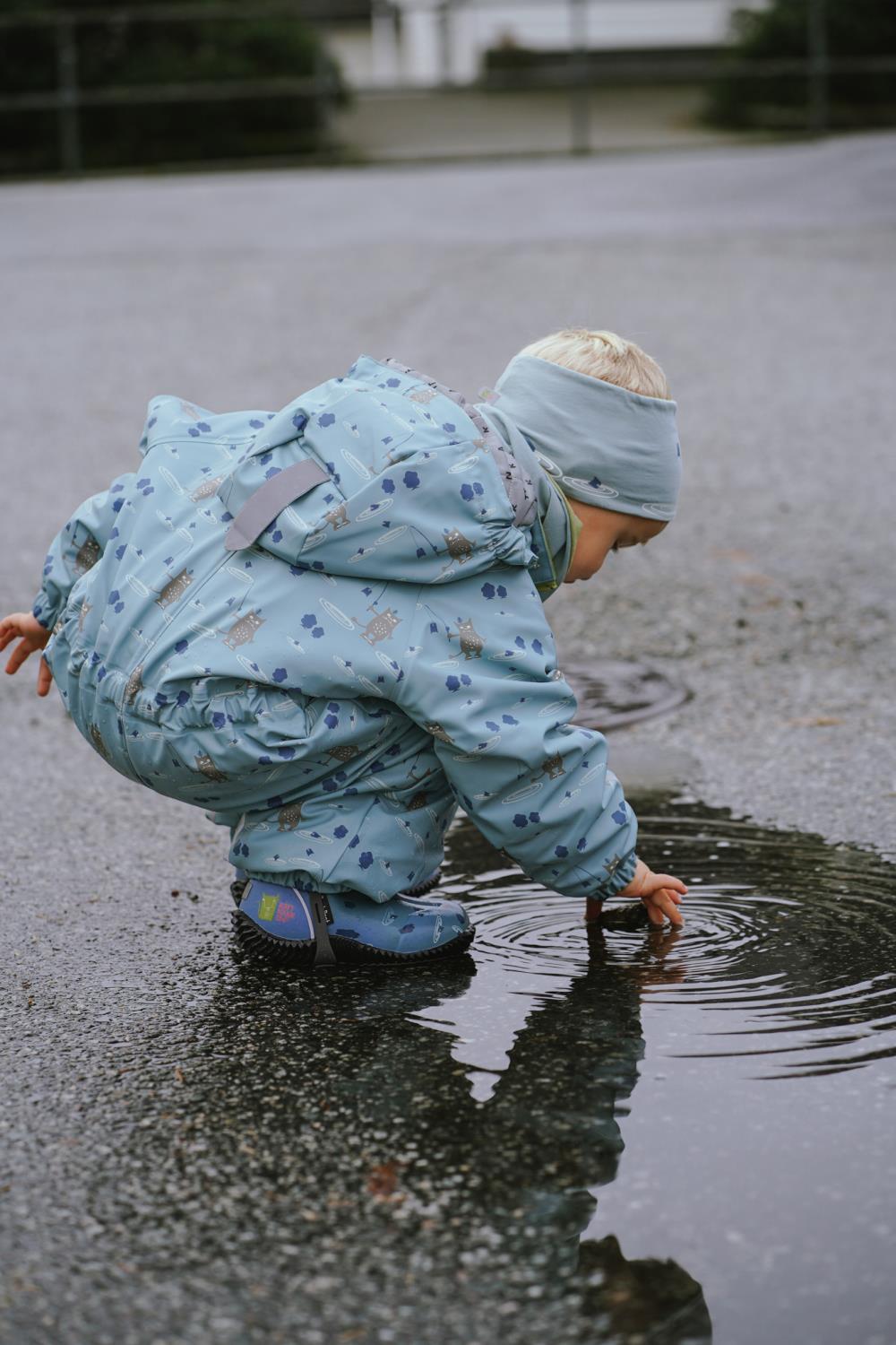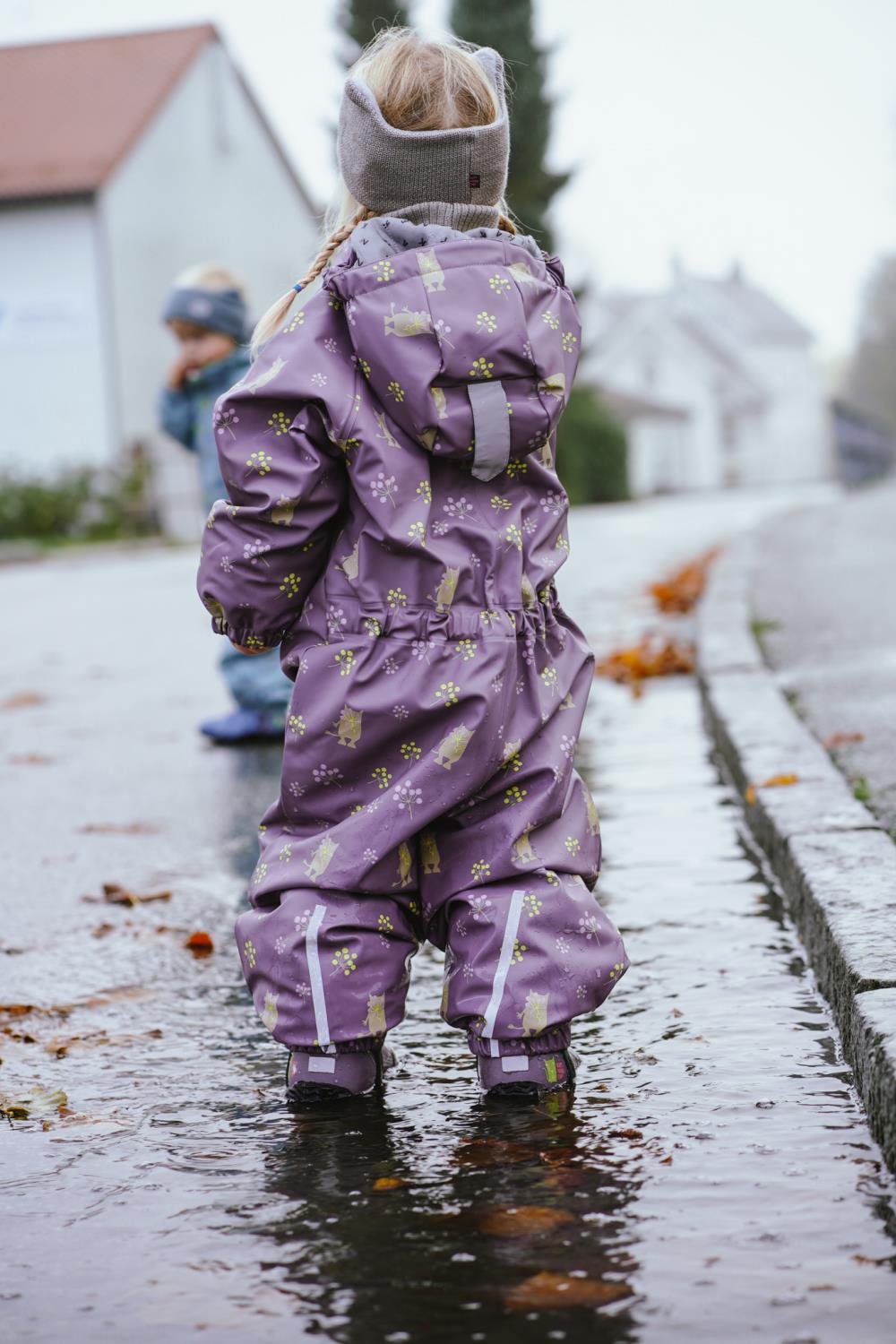 Heilårsregndress Hagl – kolleksjon «Tolvmeterskogen 2025». Den tradisjonelle Heilårsregndressen med vattering i både torso, ermer og bein. Denne regndressen tålar både øspøs regnvêr og mykje leik.