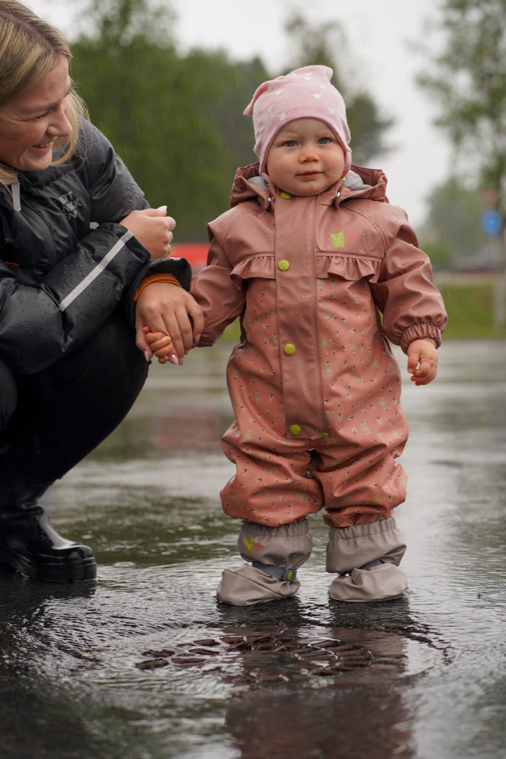 Nyheit! Babyregndress Pytt – kolleksjon «Tolvmeterskogen 2025». Dressen har mjuk og lett PU-Knit i overkropp, i mens nedre del har slitesterk PU-ekstrem. I tillegg har den fått vanntett glidlås for ekstra beskyttelse mot sølepyttane. Vattert fór på 80 gram og passar perfekt på dagar med øs pøs regnvêr, hauststorm eller vinterslaps.