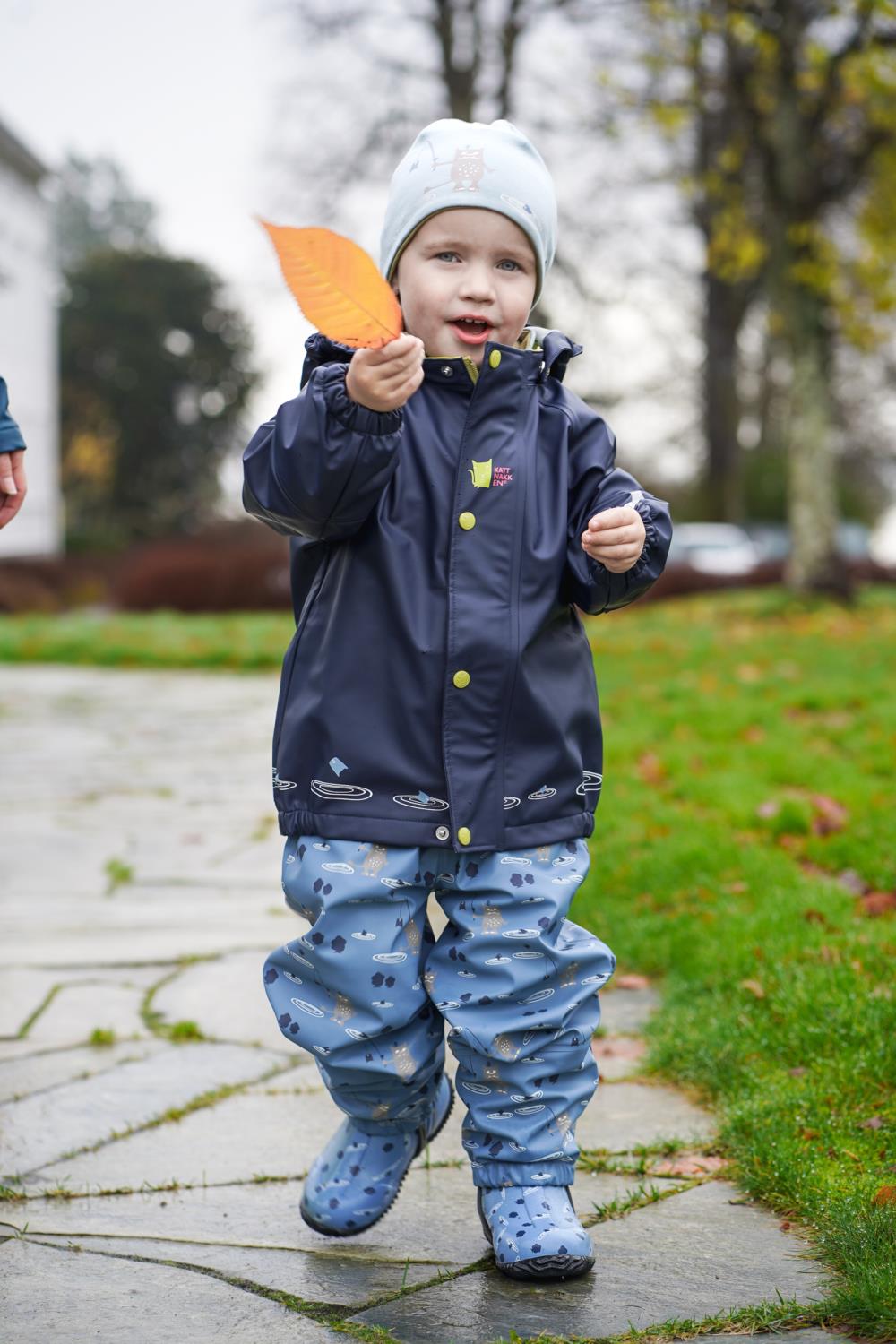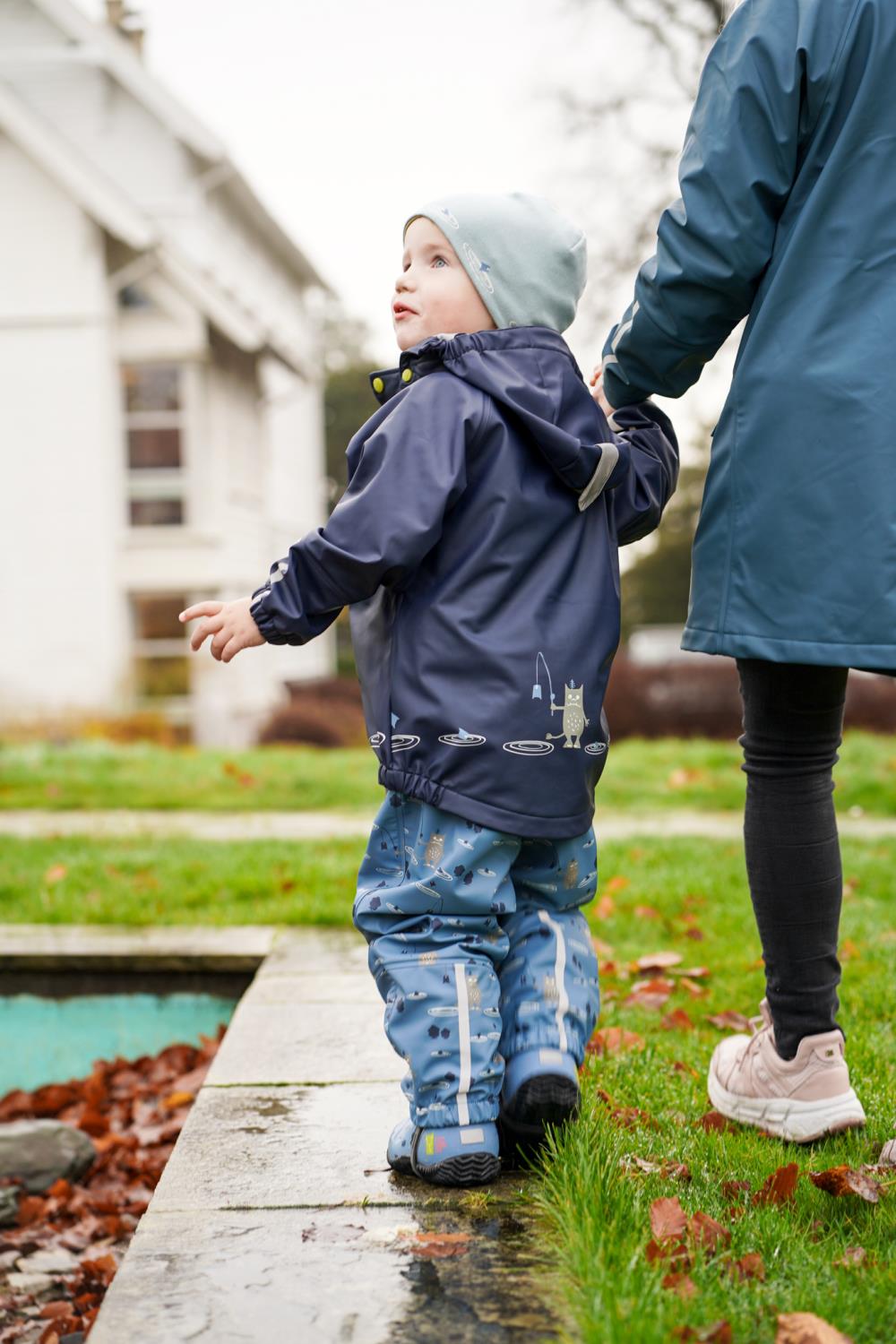 Her er både jakke og bukse i same gode PU kvalitet, med børsta innside. Det er mjuk fleece på insida av kragen og vannstopper finst i både ermer og bein. Her har me slitesterk gummistrikk under føtene, refleksar på jakke og bukse, og mykje moro i print og andre detaljar. Sveisa saumar og sikker hette som er både avtagbar og regulerbar.