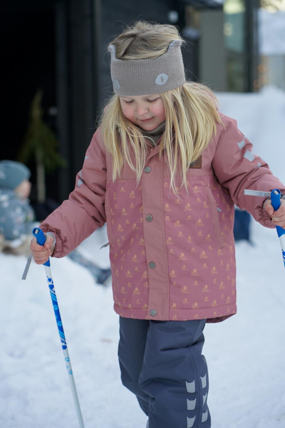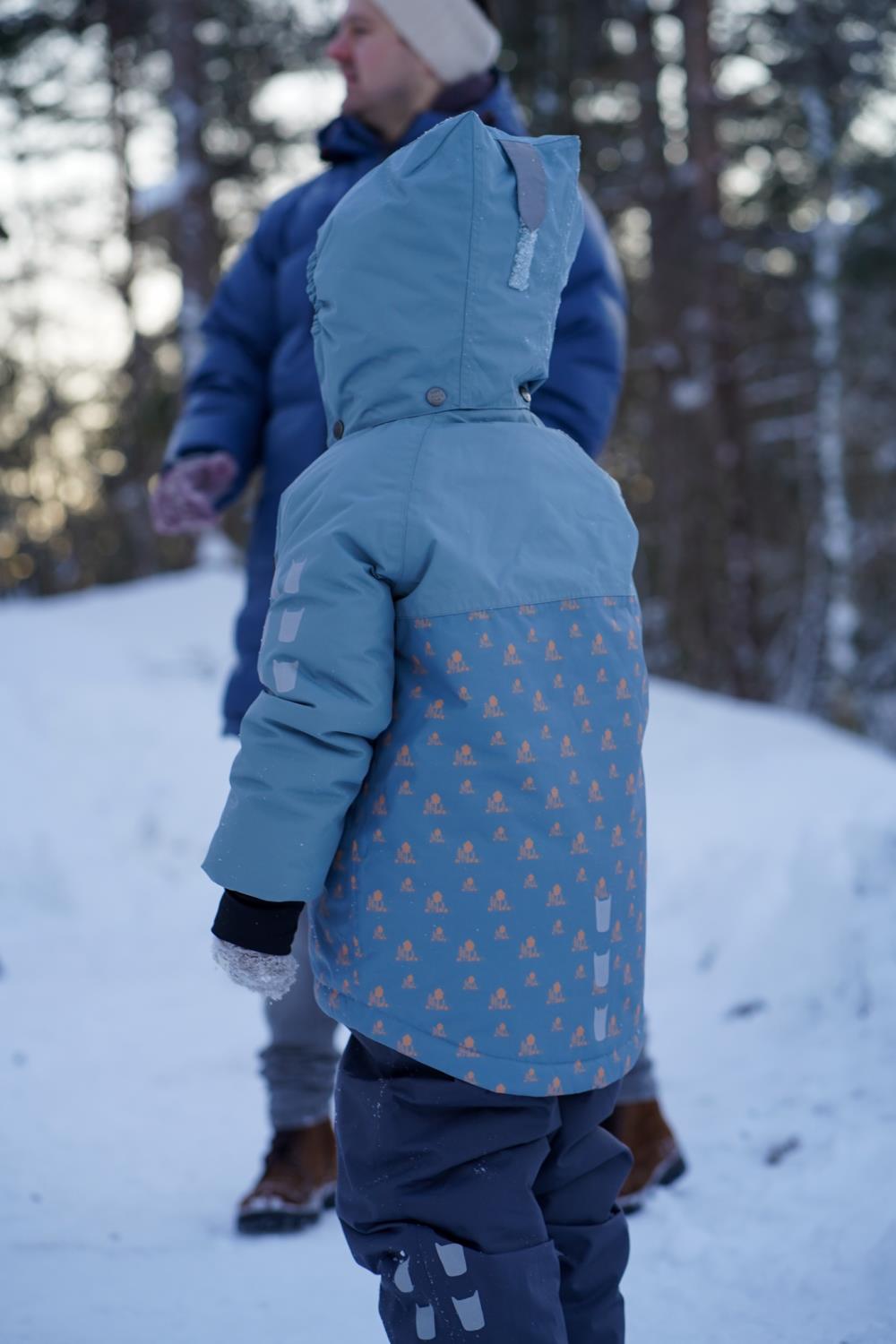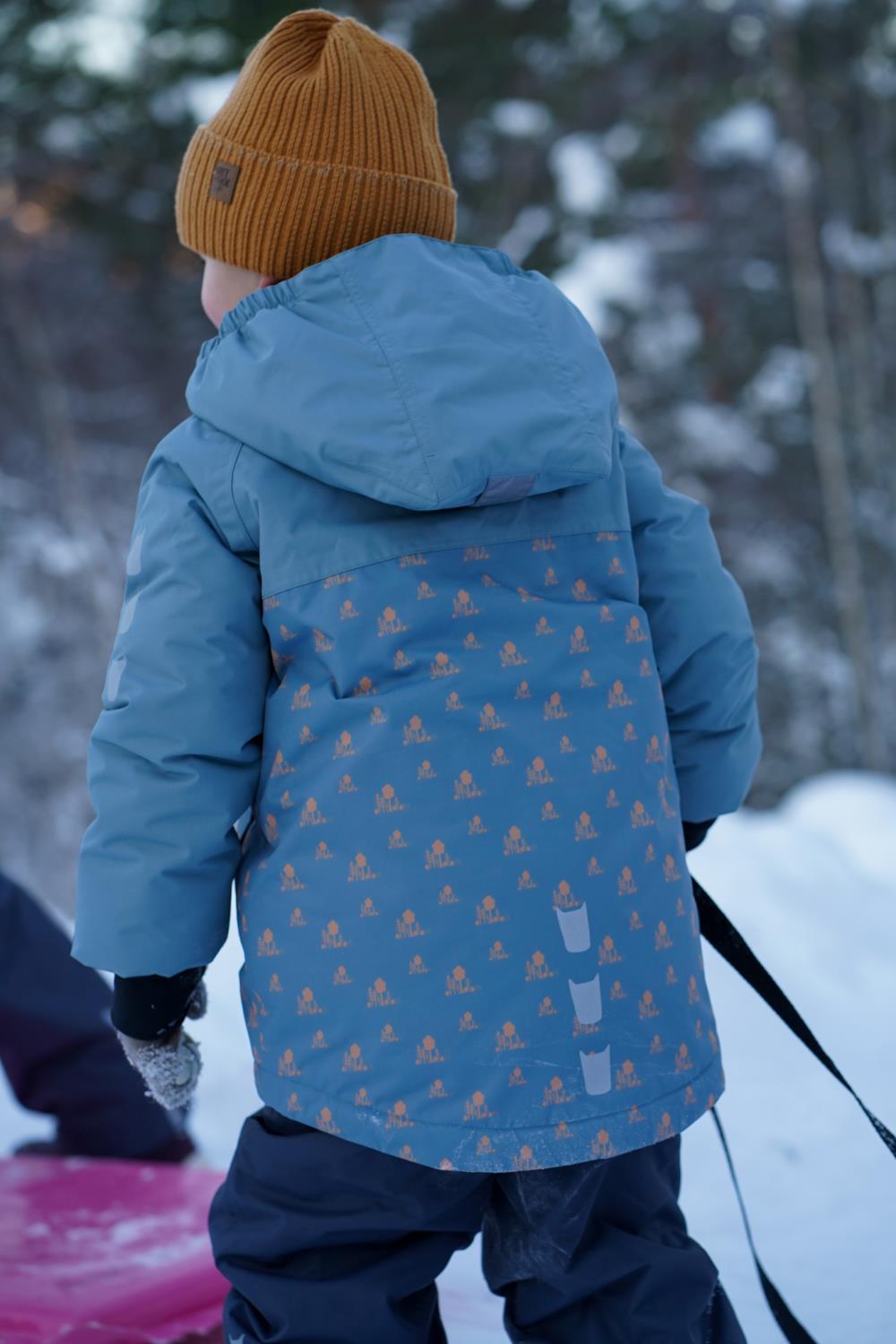 Vinterjakke Barn – kolleksjon «Tolvmeterskogen 2025». Laga for kalde vinterdager i 100 % nylon som er slitesterk (80 000 sykluser Martindale) og pustande (minst 5000 g/m2/24h). Dressen har ei vannsøyle på 12 000 og held borna tørre sjølv i våt snø. Foret er av vatt og tørker fort om ein vrenger den etter vask. Dressen er utstyrt med slitesterke fotstrikkar, namnelapp, refleksar på ermer, bein og rygg og snøstopp på ermer. Dressen har sikkerhetshette som om er både avtagbar og regulerbar.